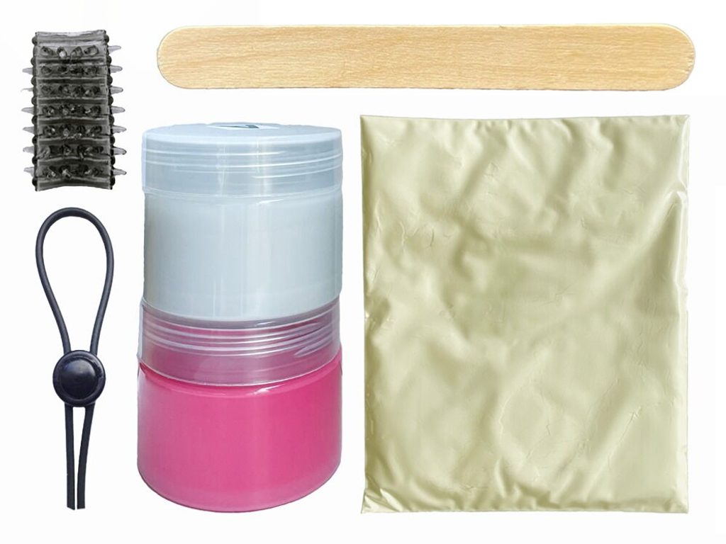 Sada skládající se z (vnější obal sady slouží jako) forma, upínací pásek na penis, manžeta, lahvička s tužidlem, 2 x 3-D gel, silikonová guma, 1 pár plastových rukavic, dřevěná špachtle, podrobný návod k použití.