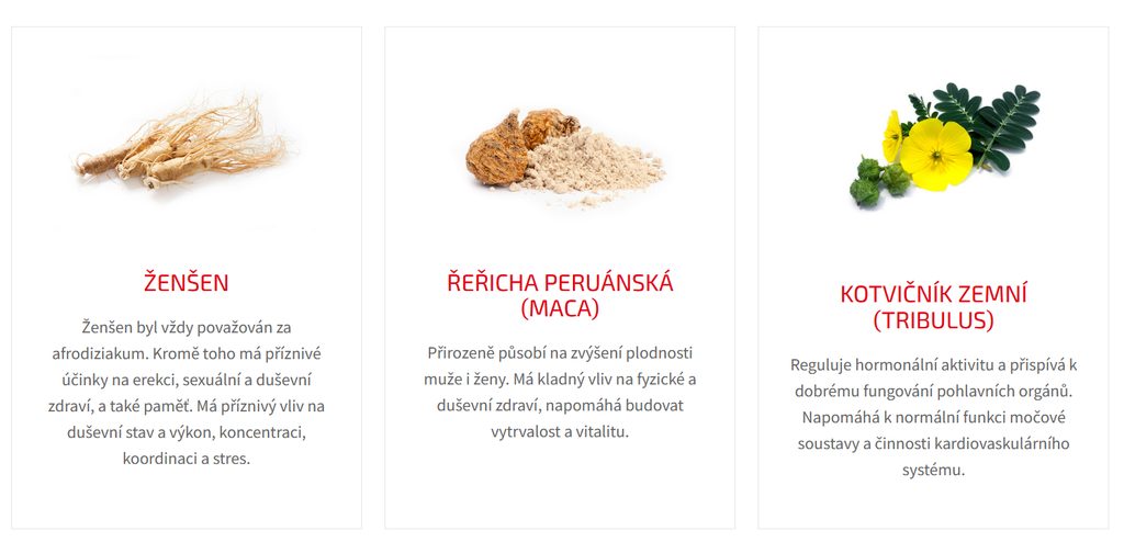 paměť, řeřicha peruánská podporuje plodnost a kotvičník zemní přispívá k dobrému fungování pohlavních orgánů.