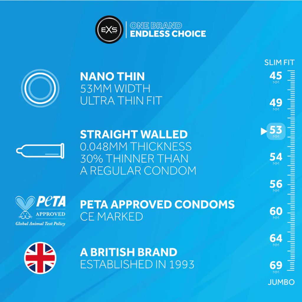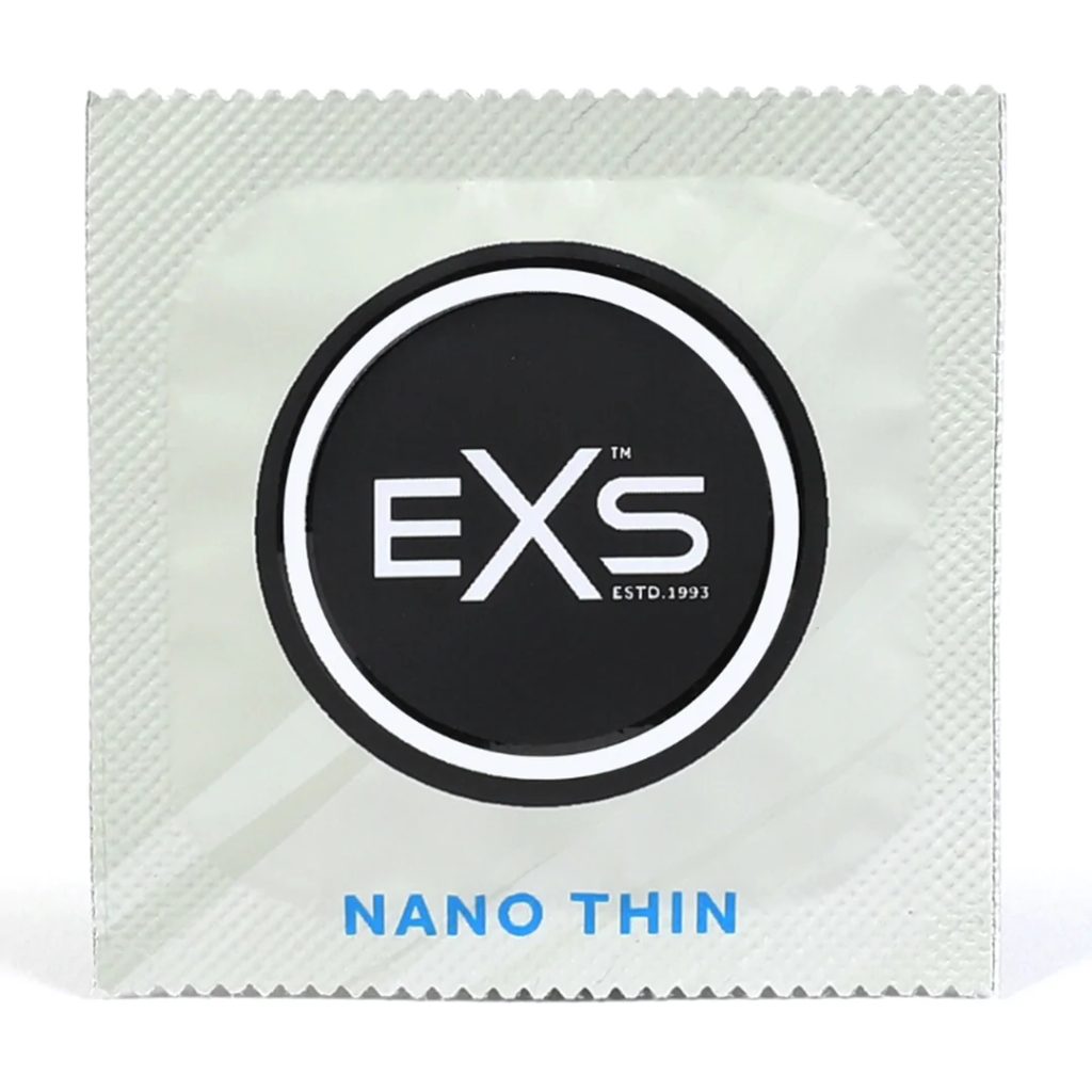 Kondomy EXS Nano Thin patří mezi nejtenčí latexové kondomy na světě. Mají šířku 53 mm, nejsou cítit latexem a máte pocit, jako byste žádný kondom neměli. Důkladně testováno podle evropských norem a Britského institutu pro standardy (BSI) Tento výrobek je extrémně tenký, ale má pevnost silnějších běžných latexových kondomů.