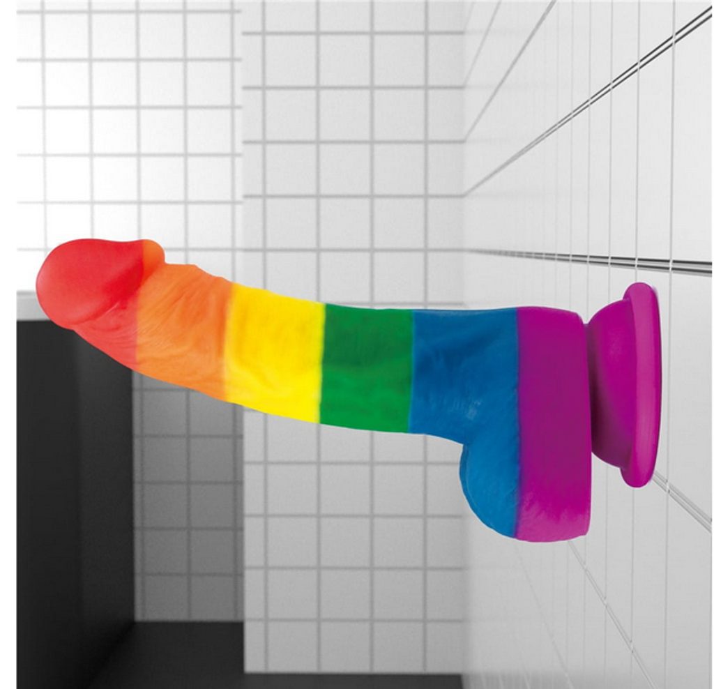 Colorful Love Dildo vyrobené z tekutého silikonu, který je měkký a bez ftalátů, s jasnými barvami Pride a přísavnou základnou, která pevně přilne k jakémukoli rovnému hladkému povrchu.