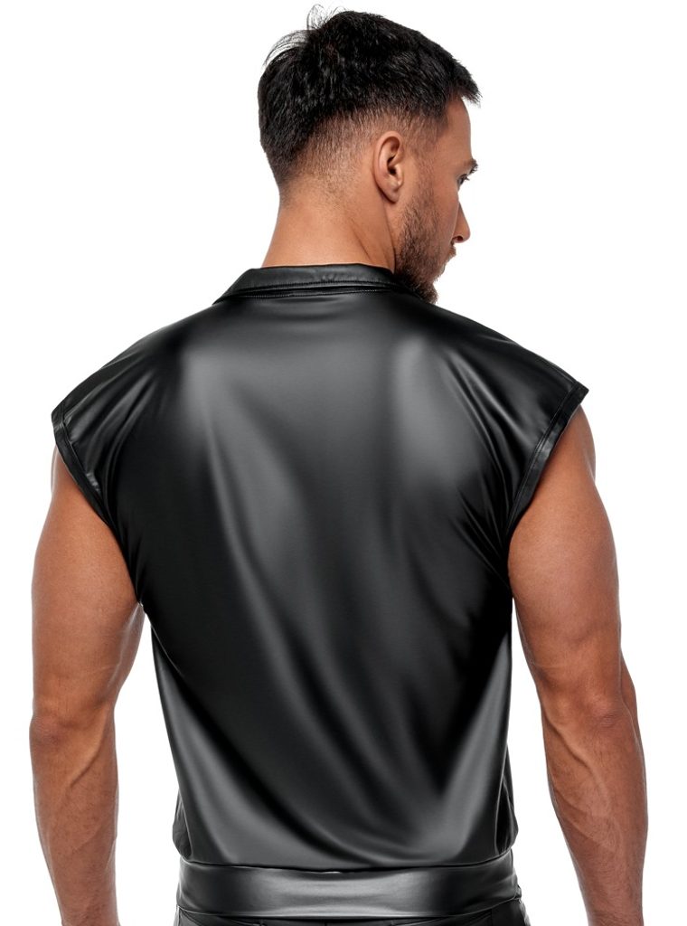 Volná casual košile od značky NEK zaujme stylovým matným vzhledem a ležérně elegantním střihem. Přední část je otevřená a překládaná, doplněná o dlouhý klopový límec zdobený kovovými cvočky, který dodává modelu výrazný biker charakter.