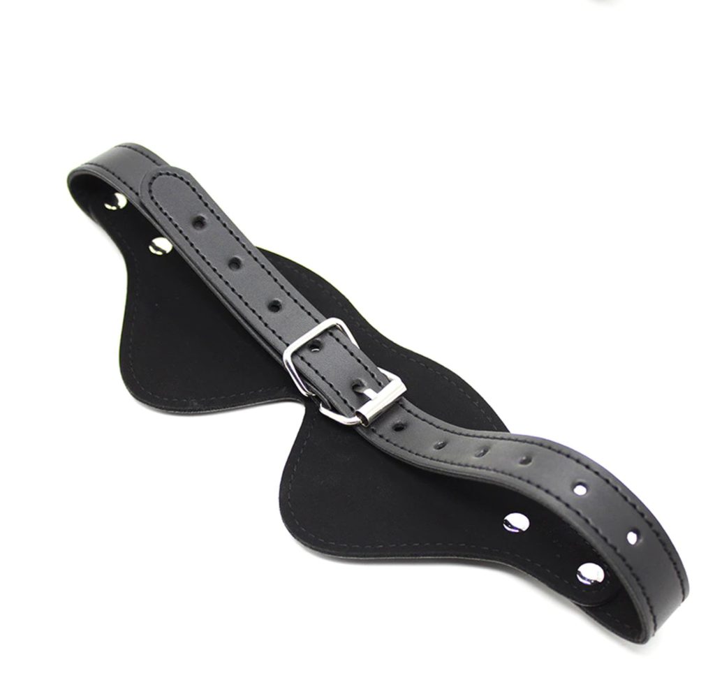 Sexy maska na oči je v černé barvě, doplněná kovovou přezkou a aplikacemi z nerezu.
