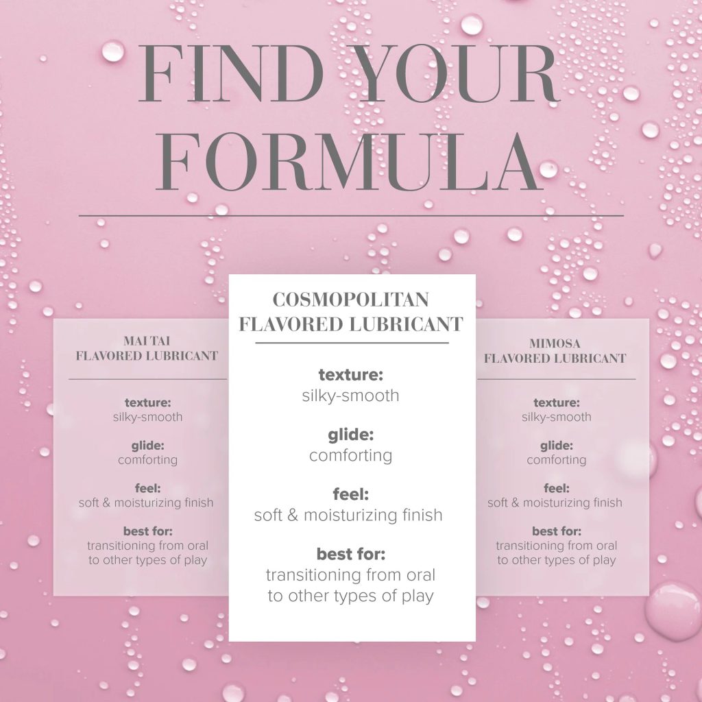 Zábava pro dospělé se snoubí s chutěmi inspirovanými koktejly v oblíbených ochucených lubrikantech na vodní bázi. Jejich smyslný a uklidňující klouzavý efekt s hedvábně hladkým pocitem je ideální pro jakýkoli intimní okamžik, zejména při přechodu z orální hry na jiné formy zábavy. Po skončení se snadno smyjí, zanechávají pokožku jemnou a hydratovanou. K dispozici jsou příchutě jako Pina Colada, Sex on the Beach a Mojito, a také nové varianty Mimosa, Cosmopolitan a Mai Tai.