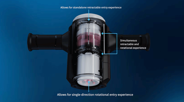 Unikátní kombinace teleskopických pohybů a rotací zajišťuje intenzivní prožitek, který si snadno přizpůsobíte díky třem rychlostem zasouvání, třem rotačním režimům a třem kombinovaným módům. Ovládání je maximálně intuitivní – stačí otočit knoflíkem na gripu a užít si plnou kontrolu nad svým potěšením.
