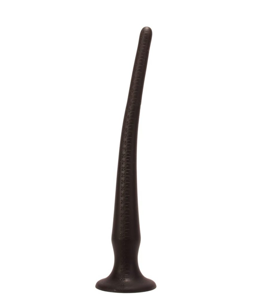 Toto extra dlouhé černé dildo můžete použít s lubrikanty na vodní bázi. Celková délka je 40 cm, použitelná délka 37 cm, průměr se pohybuje mezi 1,9 a 4,4 cm.